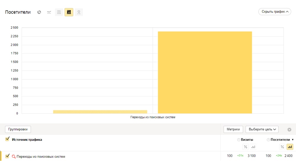 - Переходы из поисковых систем увеличились со 100 посетителей до 2400