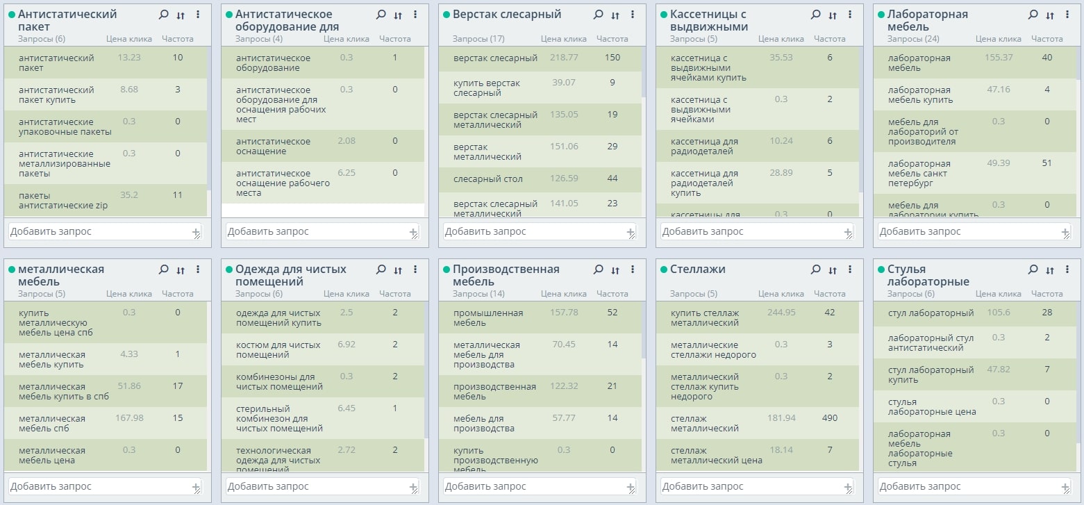 Сбор высокочастотных и среднечастотных запросов по теме производственной мебели, заказ и размещение текстов, прописывание мета-тегов.